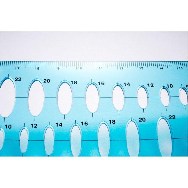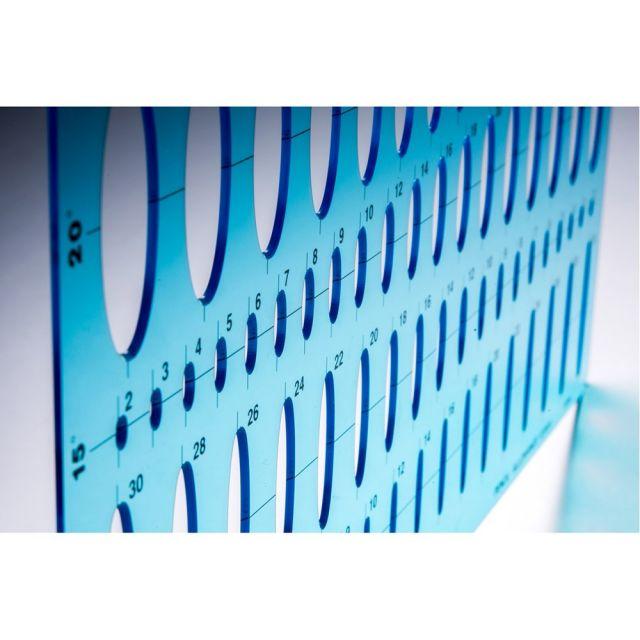 【品質の良いアクリルを精密加工し、耐久性もある総合だ円定規】透明度が高いテンプレートのため図面も識別しやすいです。また、ブルーの本体色は目にもやさしく、長時間の作業にも適しています。ペンなどを使用する際、にじみによる汚れを防止するインクエッジ付きです。0.5mmシャープペンシル用。【仕様】5°/10°/15°/20°のだ円76穴。日本製。