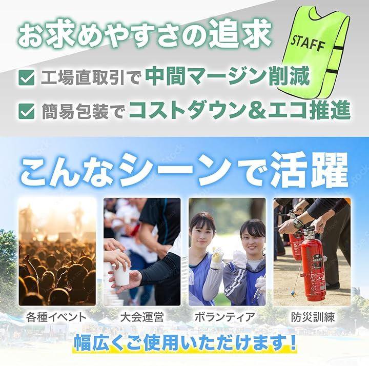「抜群の視認性」遠くからでも視認性が良いカラーに加え、前後に大きく「STAFF」の文字が印刷されているため、しっかりと目立つことができます。