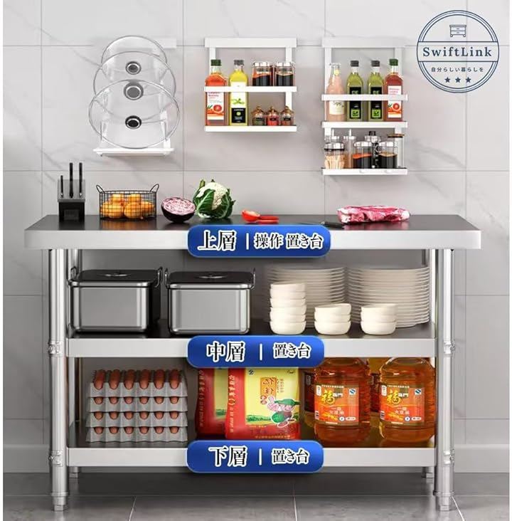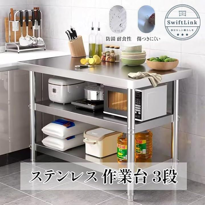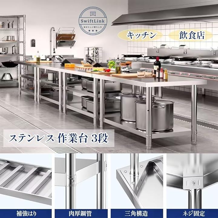 「様々な場所に適用可能」ステンレス 作業台は、キッチン・実験室・倉庫・作業場などに設置でき、業務用から家庭用まで幅広く対応。