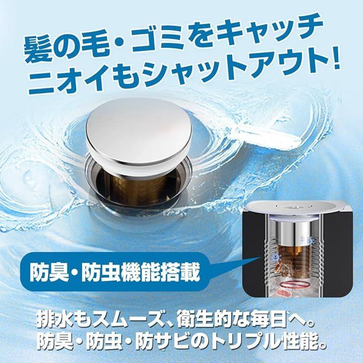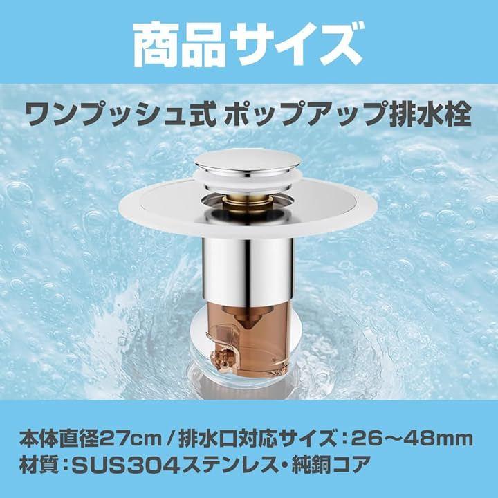 寸法:本体直径27cm/排水口対応サイズ:26–48mm/材質:SUS304ステンレス、純銅コア/仕組み:ポップアップ式(ワンプッシュ)/数量:1個