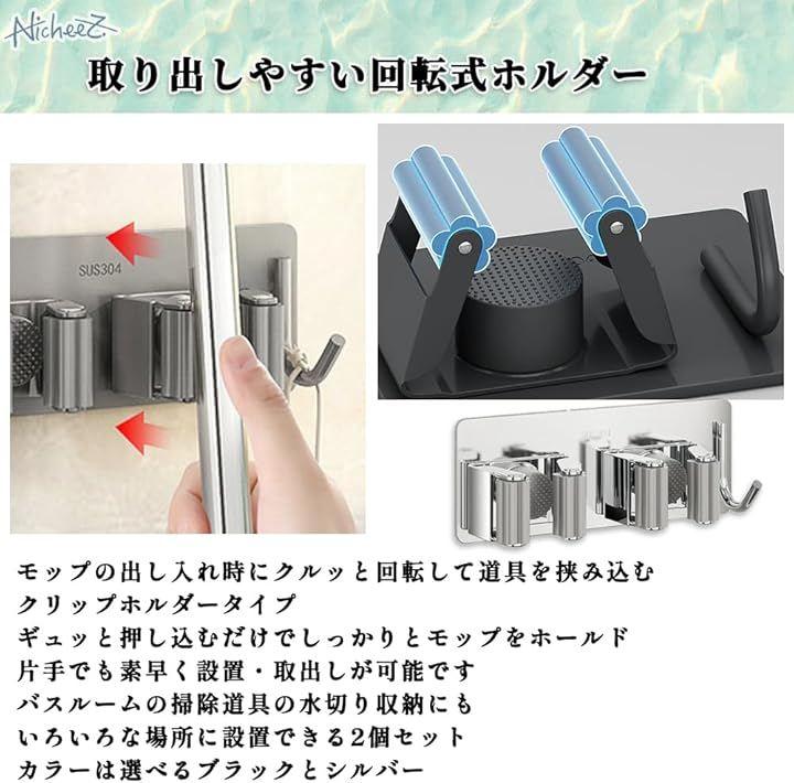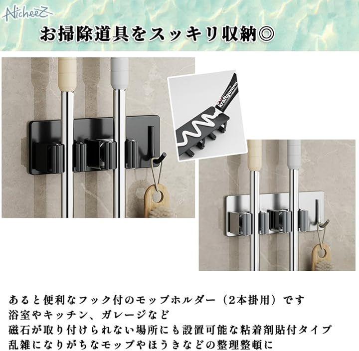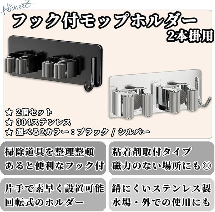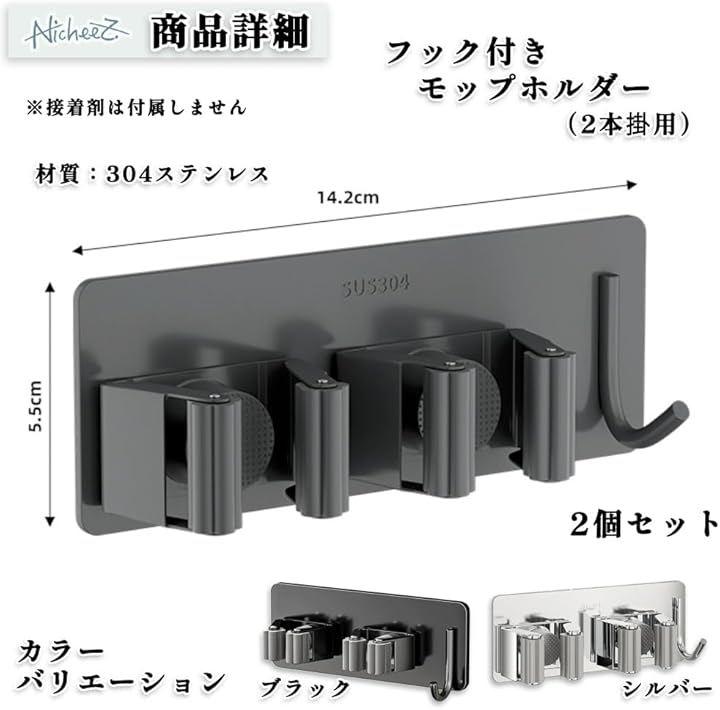 「商品内容」フック付きモップホルダー(2本用) 材質:ステンレス カラー:ブラック/シルバー サイズ:横/約14.2cm 縦/約5.5cm *接着剤は付属しません