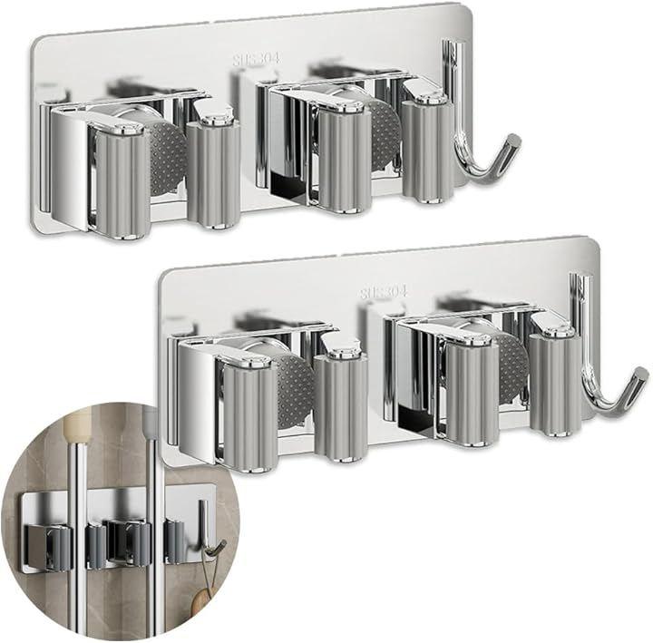 Stainless steel mop and broom holder with hooks, no drilling required, wall-mounted hanger clip, cleaning tools storage, umbrella stand, holds 2 umbrellas (set of 2)