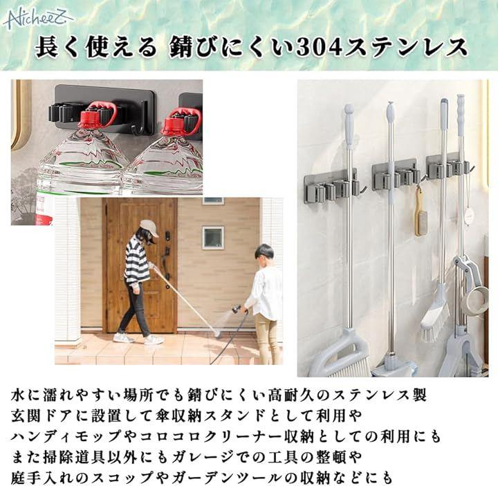 玄関ドアに設置して傘収納スタンドとして利用や、ハンディモップやコロコロクリーナー収納としての利用にもオススメ。