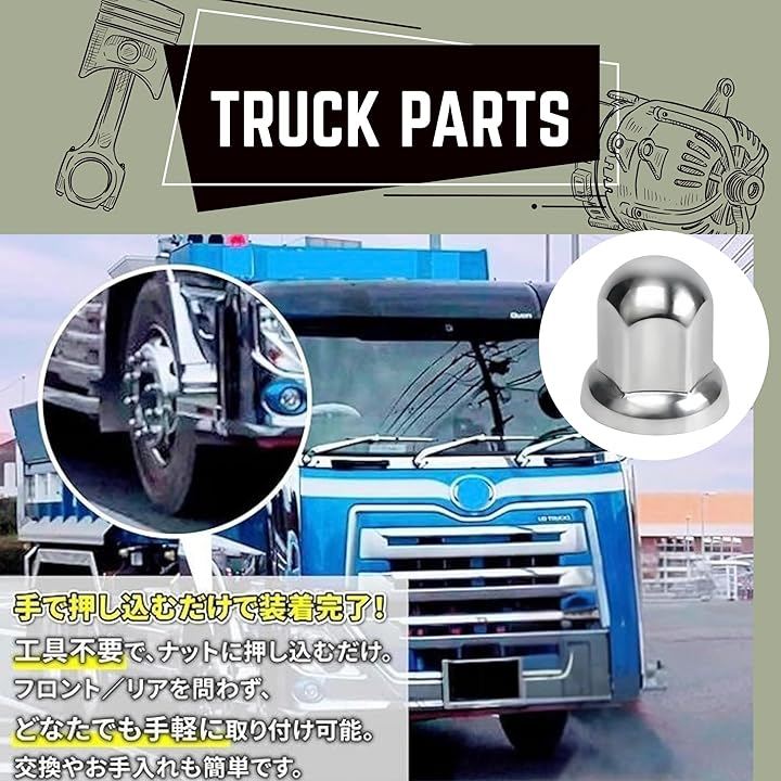 「商品仕様」 商品名:ホイールナットキャップ(ナットカバー) サイズ:32mm(ISO) 高さ:約48mm 素材:ステンレス 対応車種:大型トラック・トレーラー・ダンプ・デコトラ等 対応ホイール:10穴ホイール *ご購入前に必ずナットサイズ(32mm)をご確認ください。