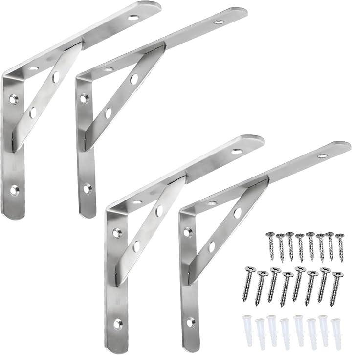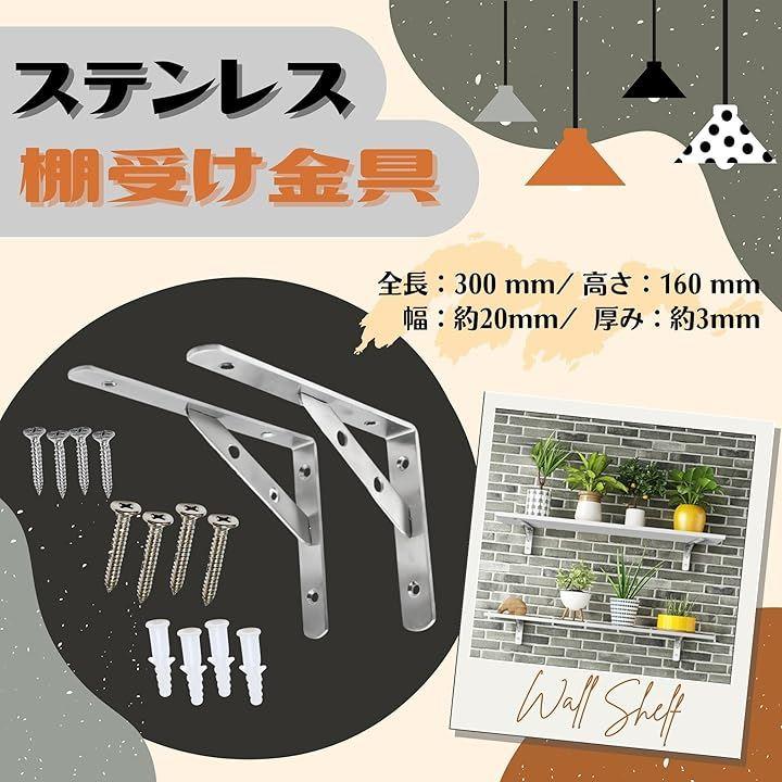「商品仕様」全長:約300mm,高さ:約160mm,幅:約20mm,厚み:約3mm,重さ:約240g(棚受け1本あたり),素材:ステンレス(ヘアライン加工),セット数:4本(付属品:棚用ネジ8本,壁用ネジ8本,樹脂製プラグ8本)*付属のネジは、写真とサイズ・形状が異なる場合があります。