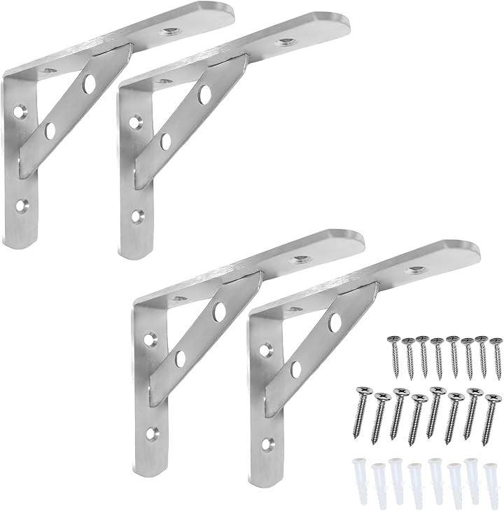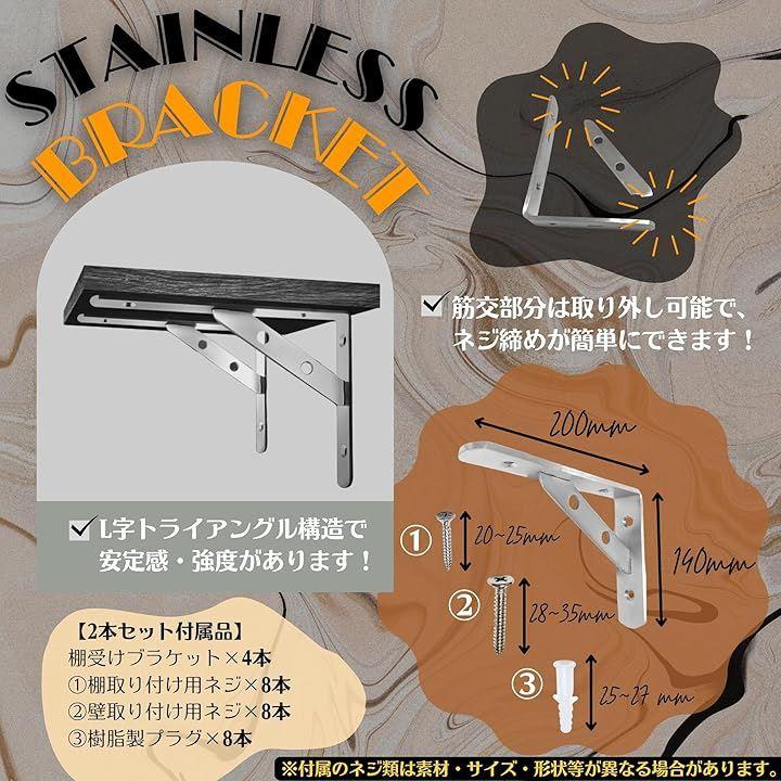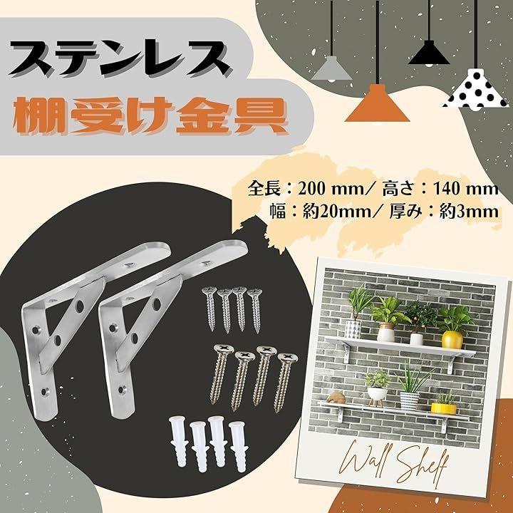 「商品仕様」全長:約200mm,高さ:約140mm,幅:約20mm,厚み:約3mm,重さ:約170g(棚受け1本あたり),素材:ステンレス(ヘアライン加工),セット数:4本(付属品:棚用ネジ8本,壁用ネジ8本,樹脂製プラグ8本)*付属のネジは、写真とサイズ・形状が異なる場合があります。