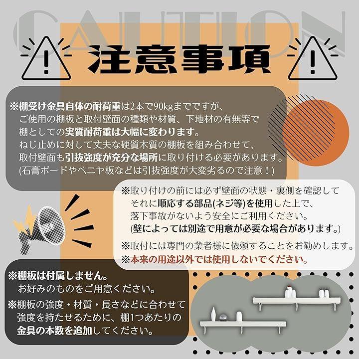 「ご注意」*棚受け金具自体の耐荷重は2本で70kgまでですが、ご使用の棚板と取付壁面の種類や材質、下地材の有無等で棚としての実質耐荷重は大幅に変わります。