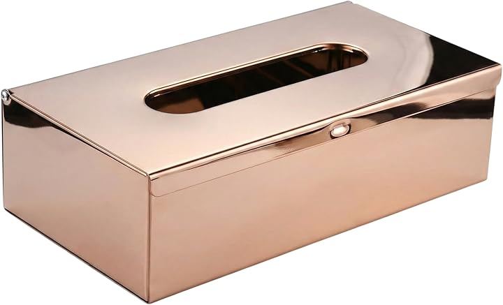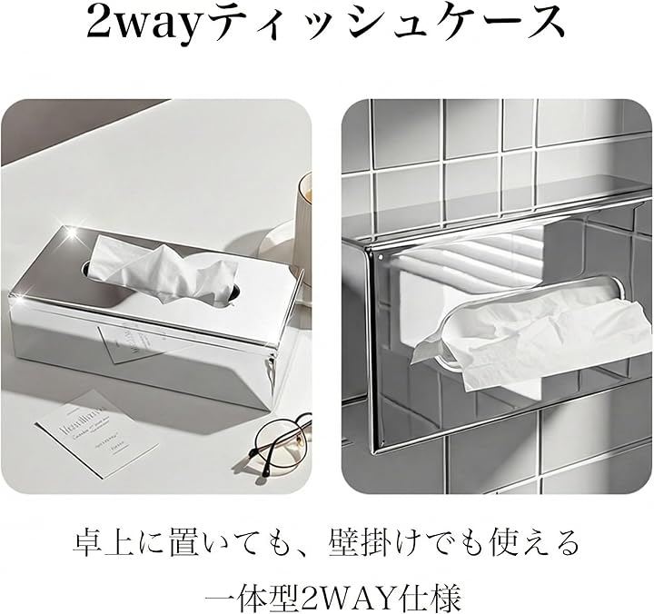 Stainless steel tissue case, 2-way design, tabletop and wall-mountable, fits a whole tissue box, stylish and simple metallic finish, perfect for living room or office.