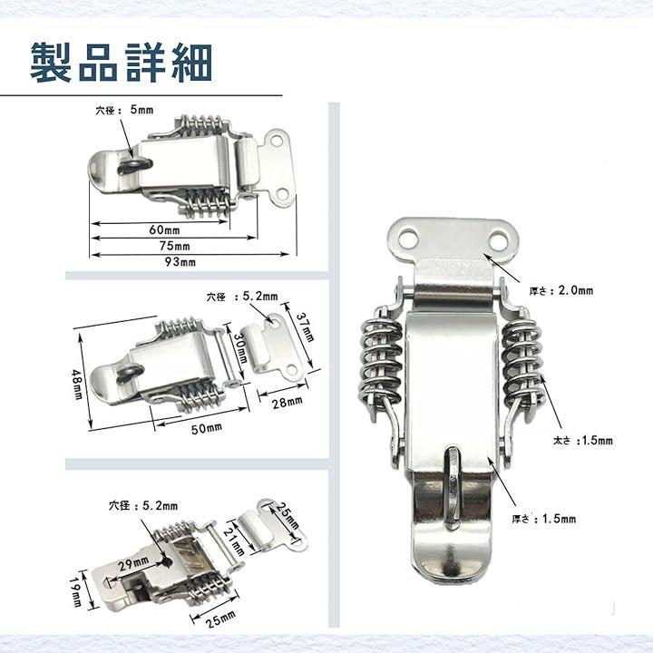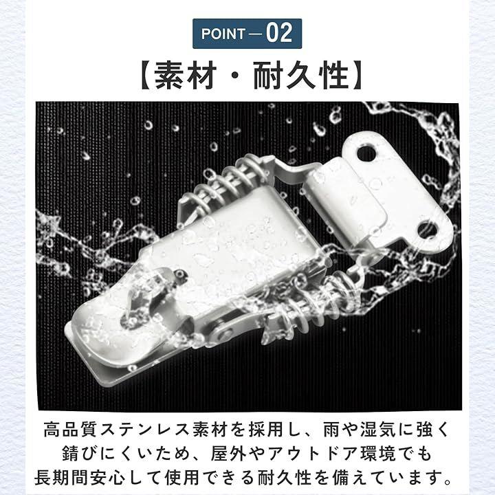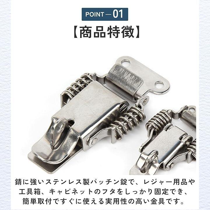 「商品特徴」錆に強いステンレス製パッチン錠で、レジャー用品や工具箱、キャビネットのフタをしっかり固定でき、簡単取付ですぐに使える実用性の高い金具です。