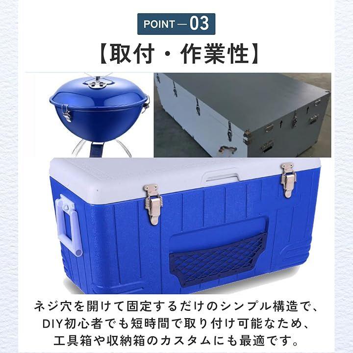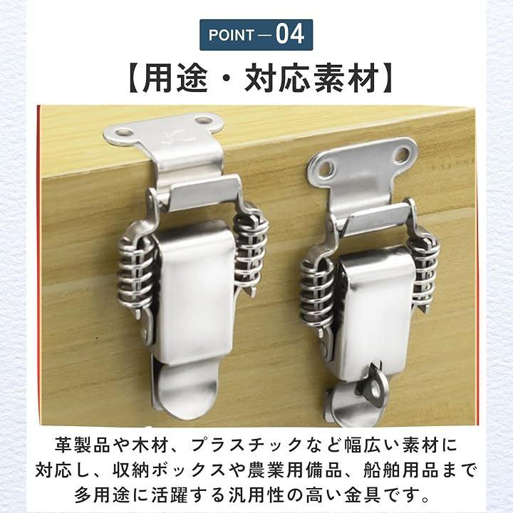「用途・対応素材」革製品や木材、プラスチックなど幅広い素材に対応し、収納ボックスや農業用備品、船舶用品まで多用途に活躍する汎用性の高い金具です。