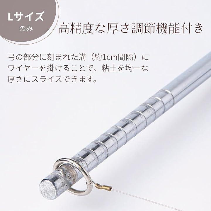「Lサイズは高精度な厚さ調節機能」 弓の部分に刻まれた溝(約1cm間隔)にワイヤーを掛けることで、粘土を均一な厚さにスライスできます。