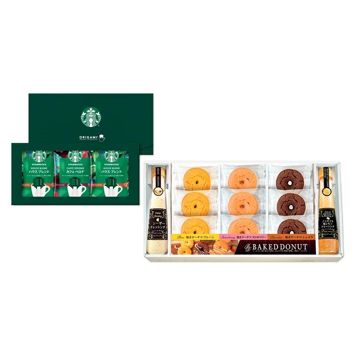 ベイクドドーナツ(プレーン・ストロベリー・ショコラ)(CALMオリジナル商品)、スターバックスオリガミ ハウスブレンド9g×各3、スターバックスオリガミ カフェベロナ9g×2、シーザーサラダドレッシング、ノンオイル塩レモンドレッシング各120ml×1【卵、乳、小麦】