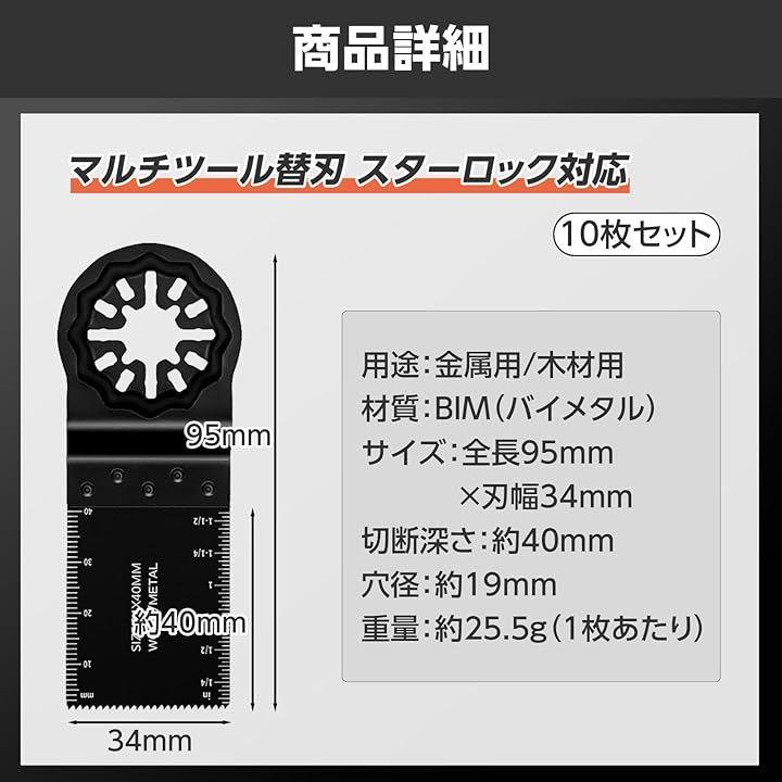 「商品詳細」全長95mm x 刃幅34mm x 切断深さ約40mm/穴径:約19mm/重量:約25.5g(1枚)/内容量:10枚セット。