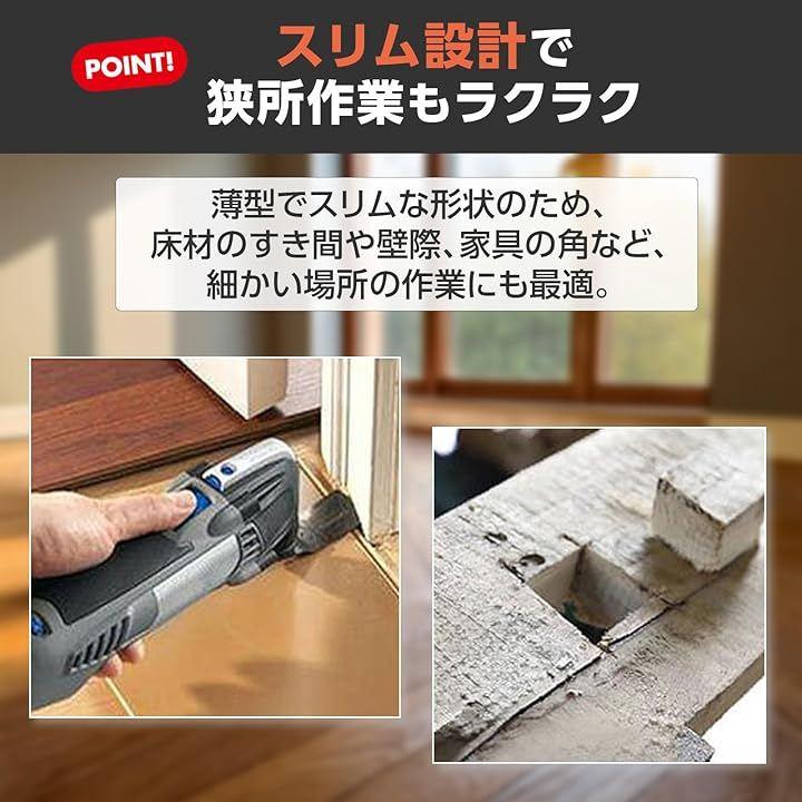 「スリム設計」薄型で狭いスペースでも作業しやすく、床材のすき間や壁際、家具の角など細部のカットに最適。