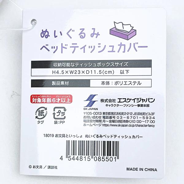 お文具といっしょのティッシュカバーです。 一見すると、ティッシュカバーには見えない!置いてあるだけでも可愛いデザインになっています! 寝室に置いてお文具さんと一緒にいい夢みましょう♪ 【収納可能なティッシュボックスサイズ:高さ4.5センチ 横23センチ 奥行11.5センチ以下】