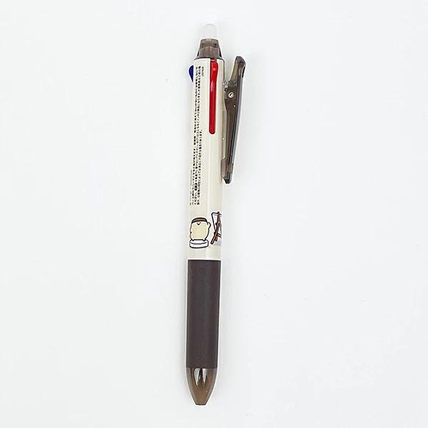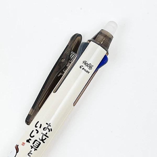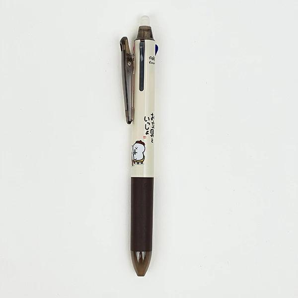 お文具さんとその仲間たちの日常を綴ったのキャラクター『お文具といっしょ』のフリクションの三色ボールペンです♪摩擦熱で筆跡を消去できるのでとっても便利!【仕様】多色ゲルインキボールペン、方式:スライドレバー式、インキ色:黒・赤・青、ボール径…0.5mm