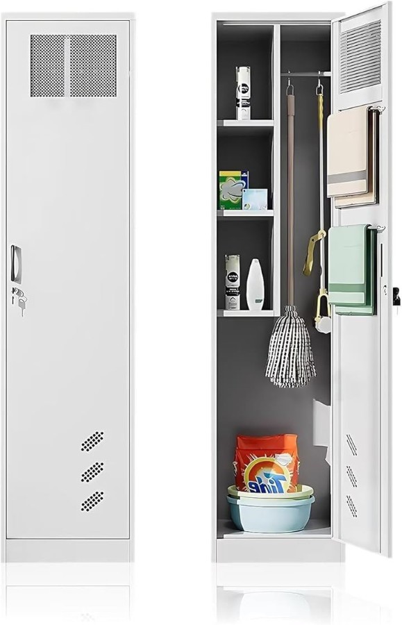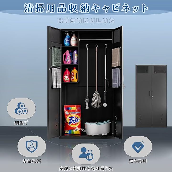 モップ、ほうき、雑巾、洗剤などの清掃用具をスッキリ収納し、作業効率を向上させます。