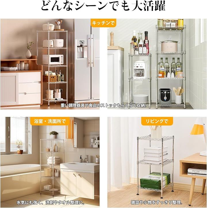 「いろんなシーンで大活躍」このラックはキッチンの食器整理、洗面所のタオル収納に最適です。