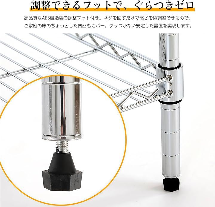 床の凹凸にも対応する調整可能なフットが付いており、安定した設置が可能です。