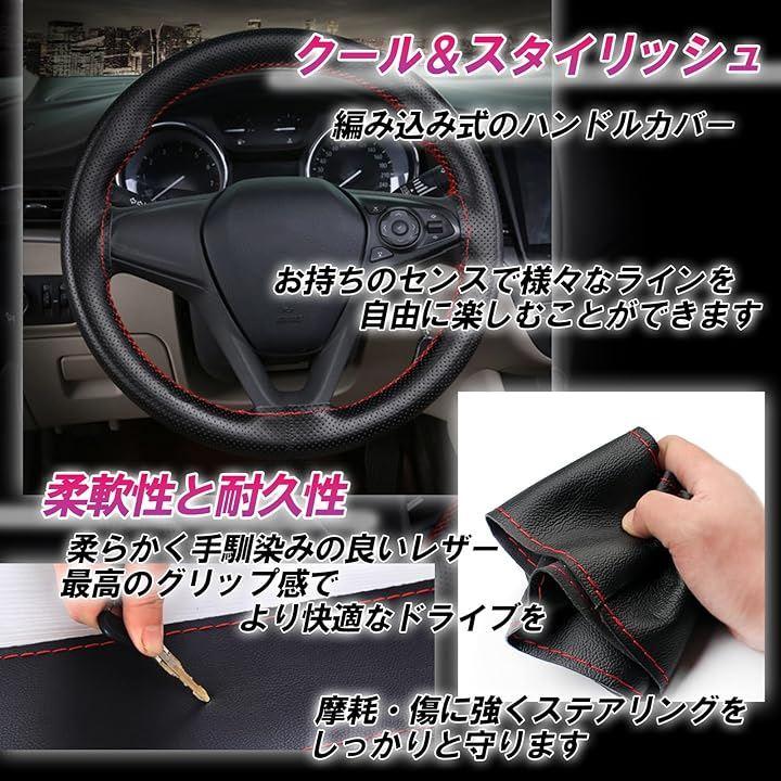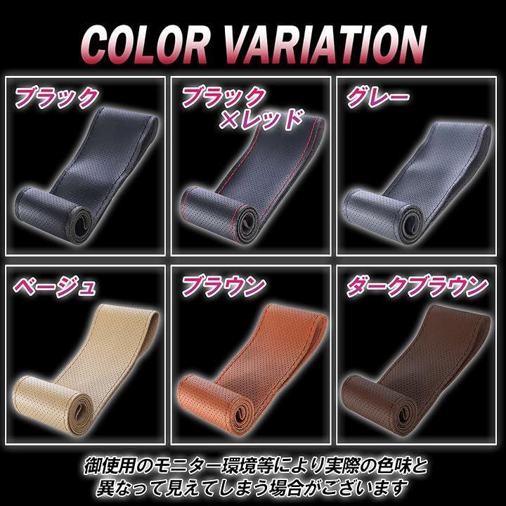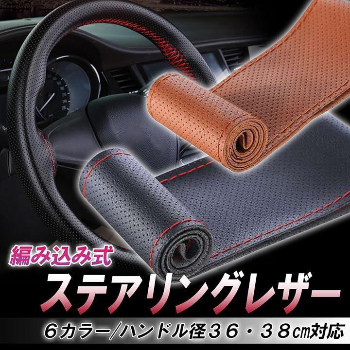 「カラー」6種類「ブラックレザー、ブラック糸」「ブラックレザー、レッド糸」「グレーレザー、グレー糸」「ベージュレザー、ベージュ糸」「ブラウン、ブラウン糸」「ダークブラウン、ダークブラウン糸」ハンドル径36cmとハンドル径38cmに対応したバリエーションがありますので、スポーツから軽トラまで幅広い車種に対応できます。
