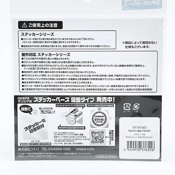 シュタインズ・ゲートの「未来ガジェット研究所」のメンバー(ラボメン)のイニシャルが配置されたシンボルマークのステッカーです。光や水に強い屋外対応なので車などに貼るのに適しています。PCや車など好きな所に貼ればあなたもラボメンの一員です♪