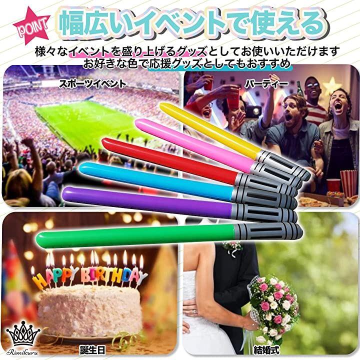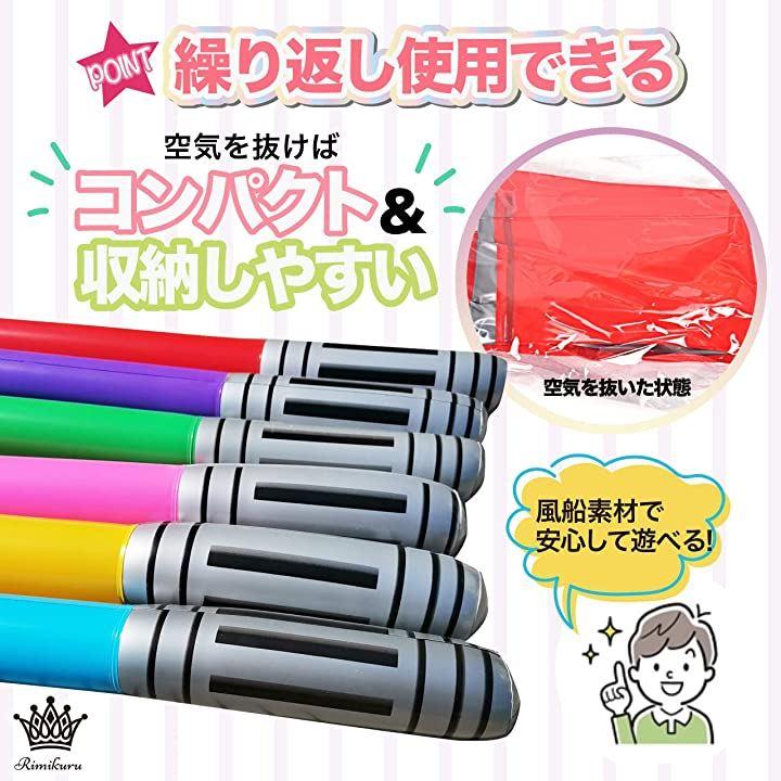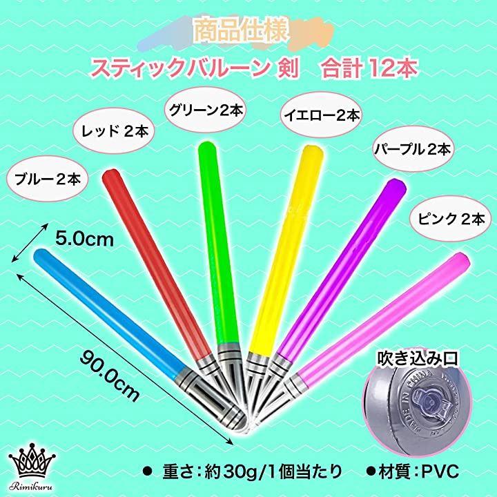 ・「商品仕様」セット内容:スティックバルーン 剣 グリーンx2本 , ブルーx2本 , レッドx2本 , イエローx2本 , パープルx2本 , ピンクx2本 合計12本セット サイズ:(膨らませたサイズ)約5.0cmx90.0cm 重さ:約30g/1個当たり 材質:PVC *モニターの環境等により、色の見え方に若干差が生じる場合がございます。