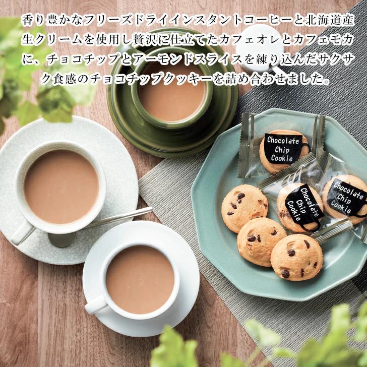 香り豊かなフリーズドライインスタントコーヒーと北海道産生クリームを使用し贅沢に仕立てたカフェオレとカフェモカに、チョコチップとアーモンドスライスを練り込んだサクサク食感のチョコチップクッキーを詰め合わせました。