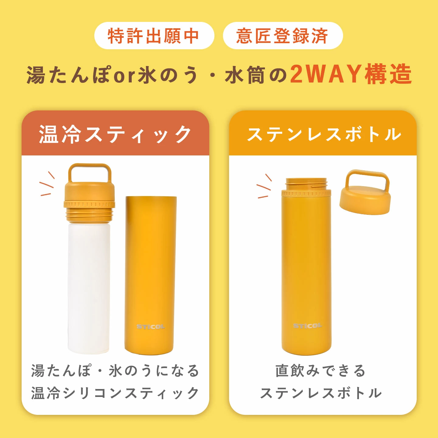 「ステンレスボトル」と「シリコン湯たんぽ」がひとつになった便利アイテム「繰り返し使える STICOL 2in1 BOTTLE」。