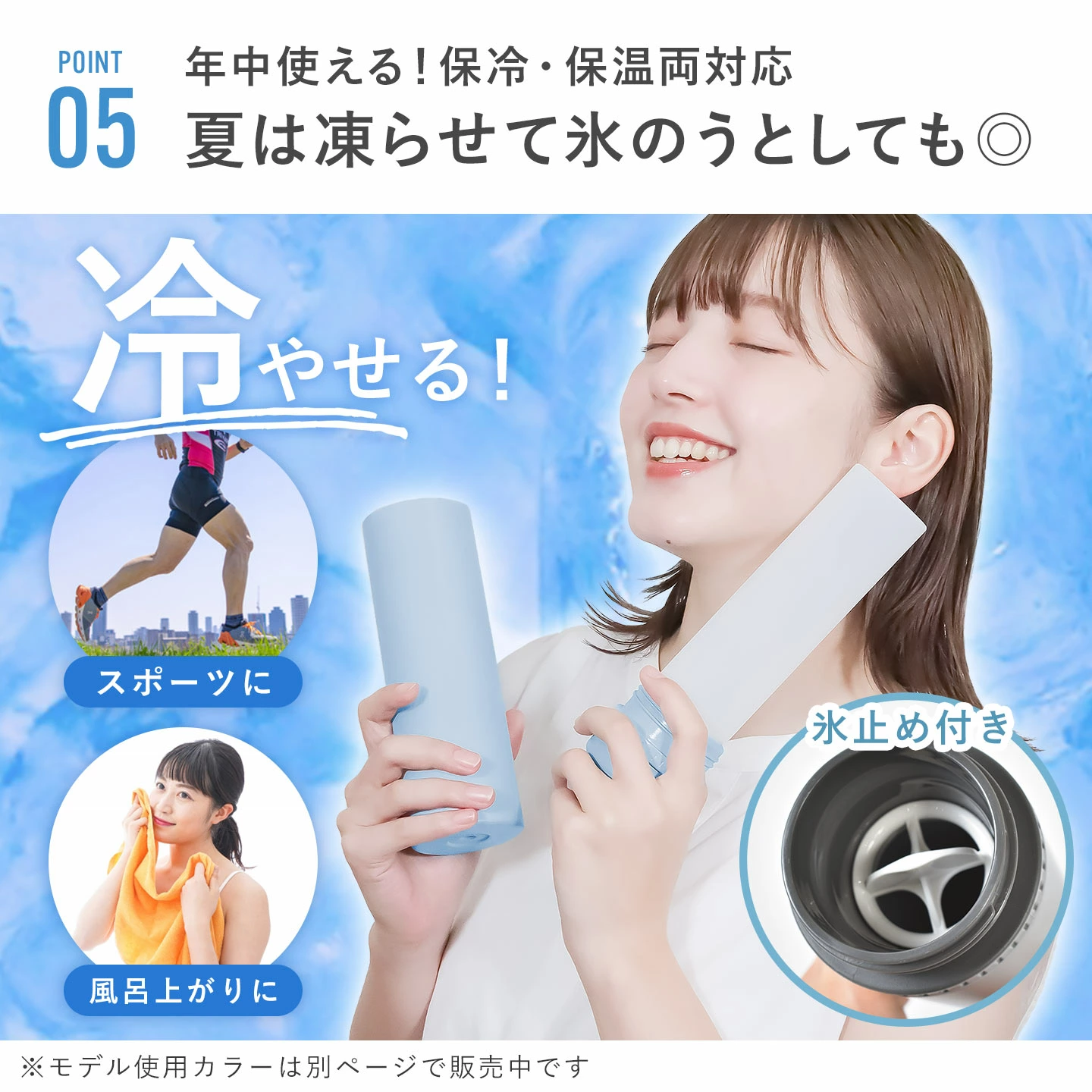 水筒がそのまま湯たんぽになるから、荷物を増やさなくていいのが嬉しいポイント◎ボトルは中の温度を逃がさない真空二重構造でお出かけ中ずっと保温・保冷状態をキープ!