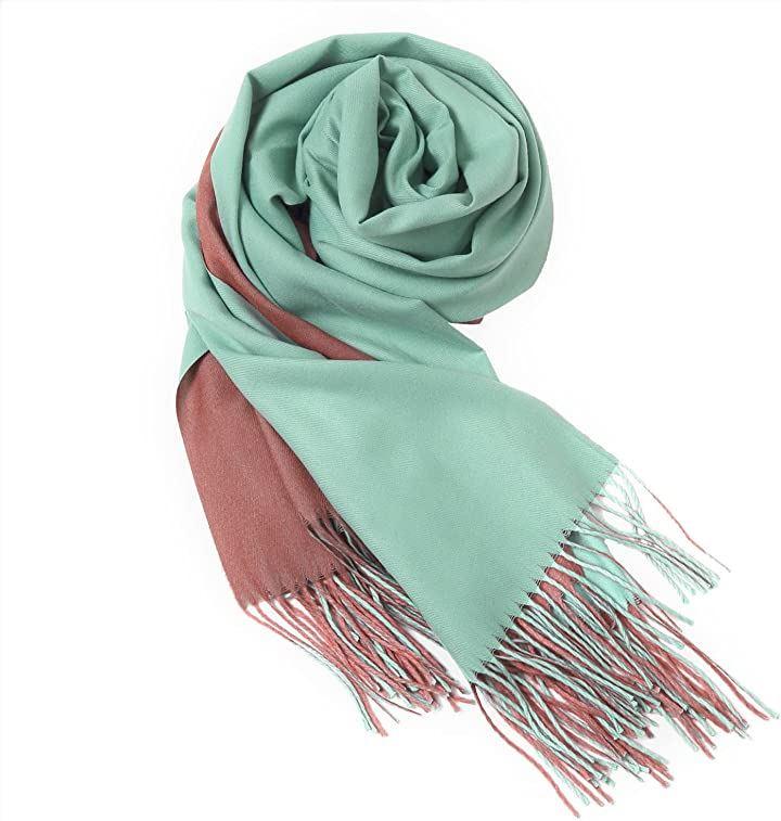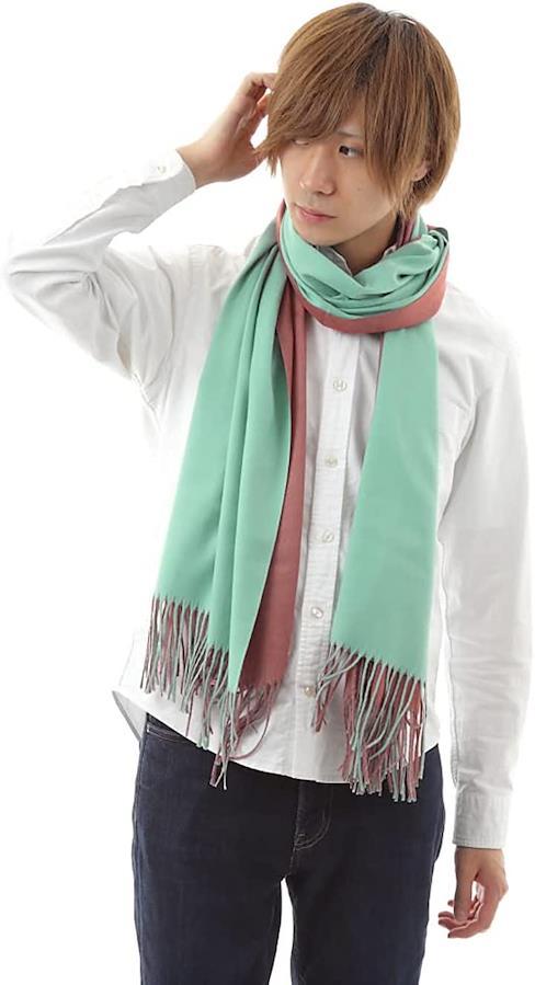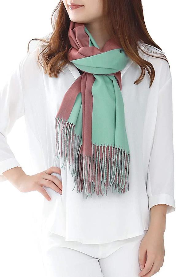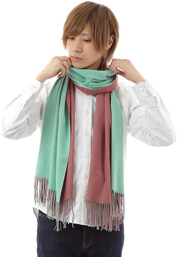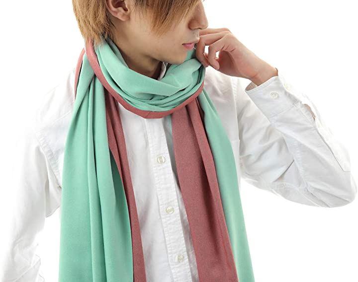 「寒さ対策に、コーディネートのアクセントに、1枚持っておくと便利な無地のリバーシブルストールです」表と裏でカラーが異なるので、巻き方によって印象を変えることができます。