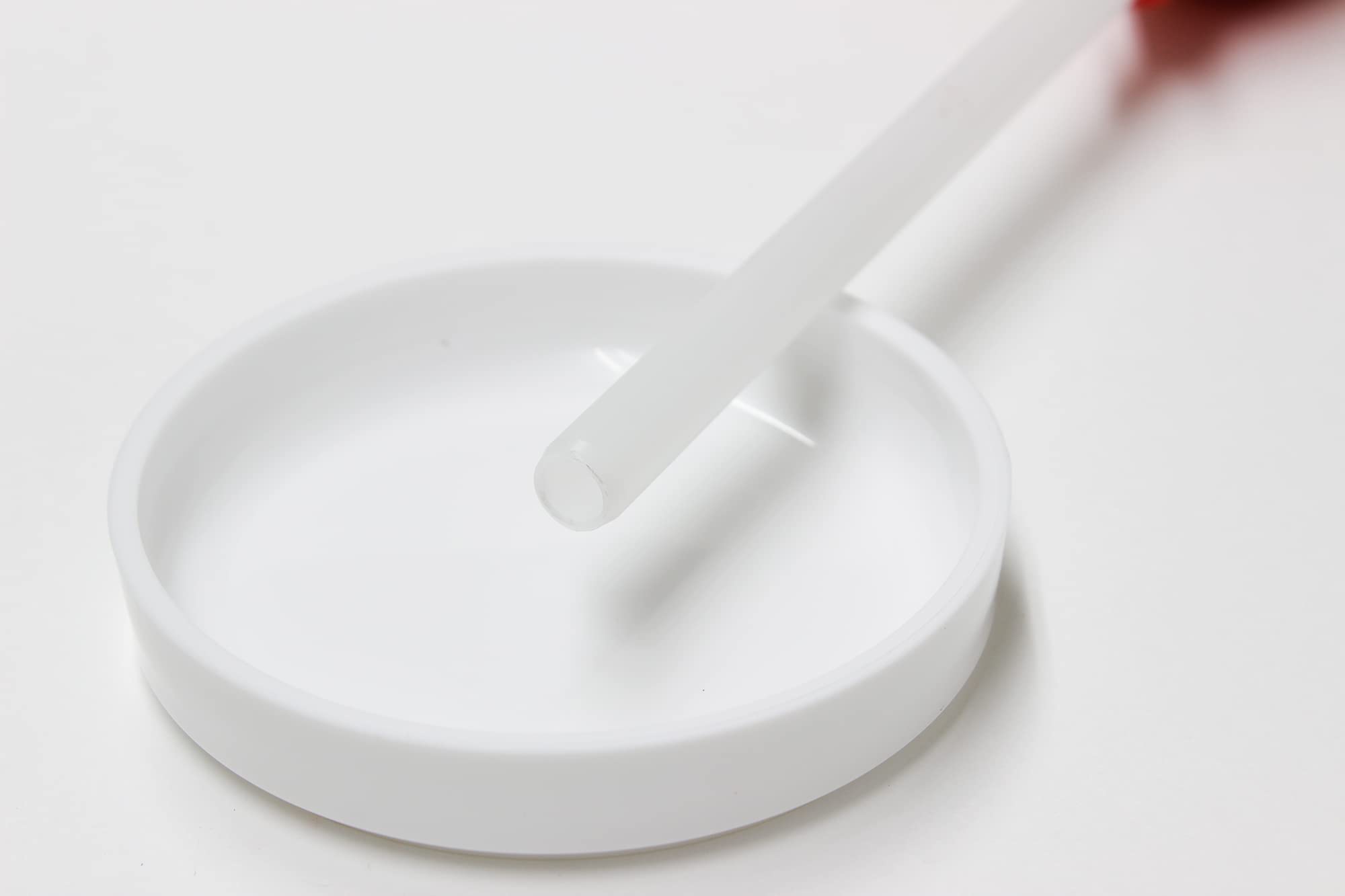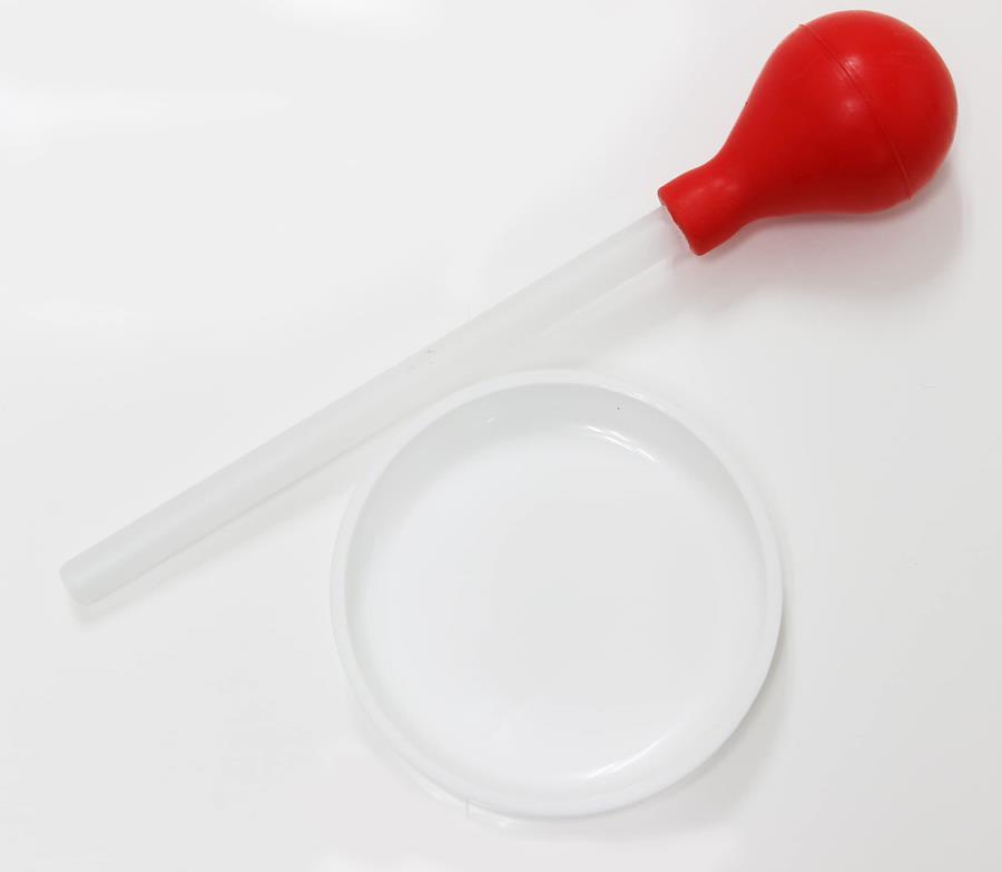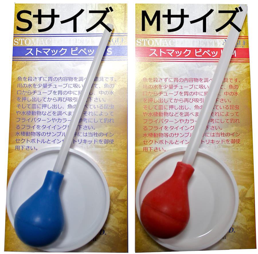 魚を殺さずに胃の内容物を調べる道具です。川の水を少量チューブに吸い上げて、魚の口からチューブを胃の中に挿入し、中の水を押し出してから再び吸引して下さい。そして皿に押し出し、魚の食べている昆虫や水棲動物などを調べます。それによってフライパターンやカラーの参考にして釣れるフライをタイイングして下さい。
