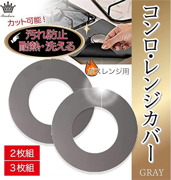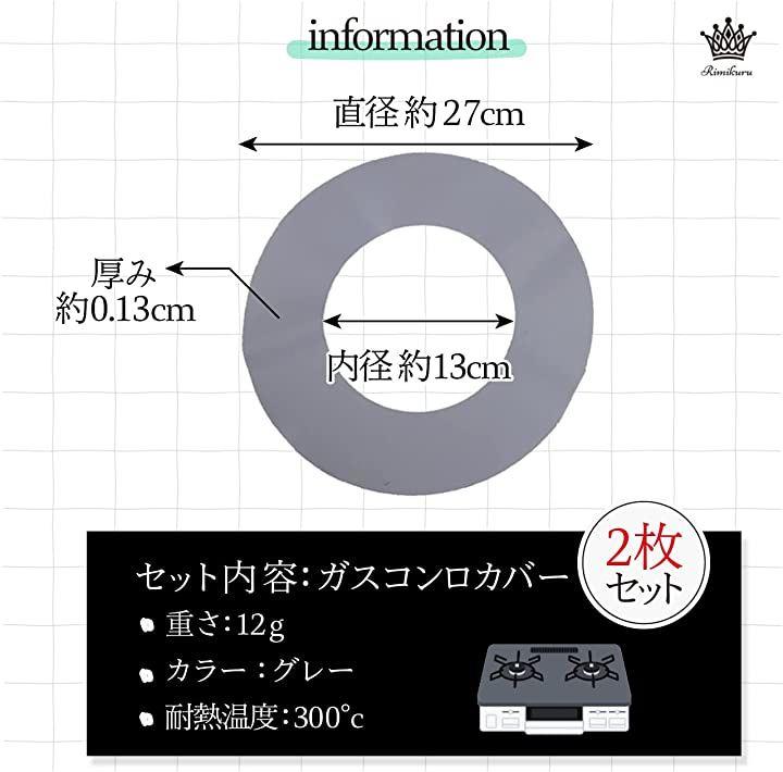 ・「商品仕様」セット内容:ガスコンロカバー x 2枚セット サイズ:直径 約27cmx0厚み 約13cm 内径 約13cm 重さ:約12g カラー:グレー 耐熱温度:300℃ *モニターの環境等により、色の見え方に若干差が生じる場合がございます。