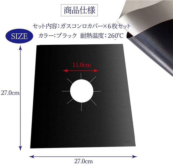 ・「商品仕様」セット内容:ガスコンロカバー x 6枚セット サイズ:27.0cmx27.0cm カラー:ブラック 耐熱温度:260℃