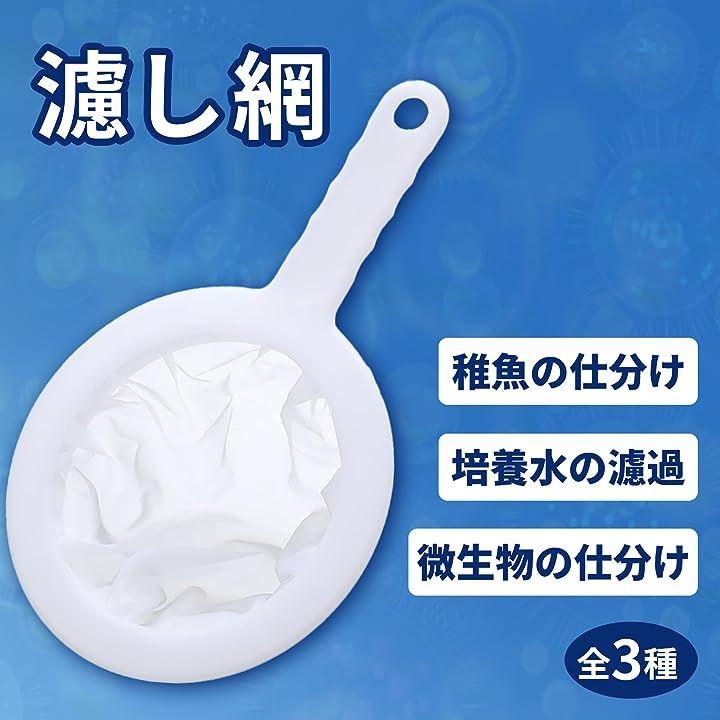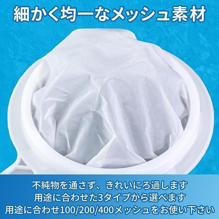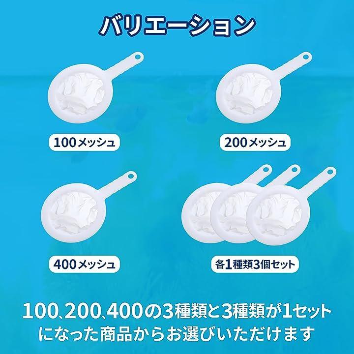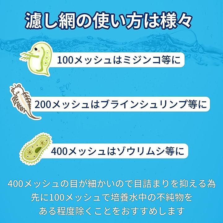 100メッシュはミジンコ、200メッシュはブラインシュリンプ、400メッシュはゾウリムシなどを濾すのにおすすめです。