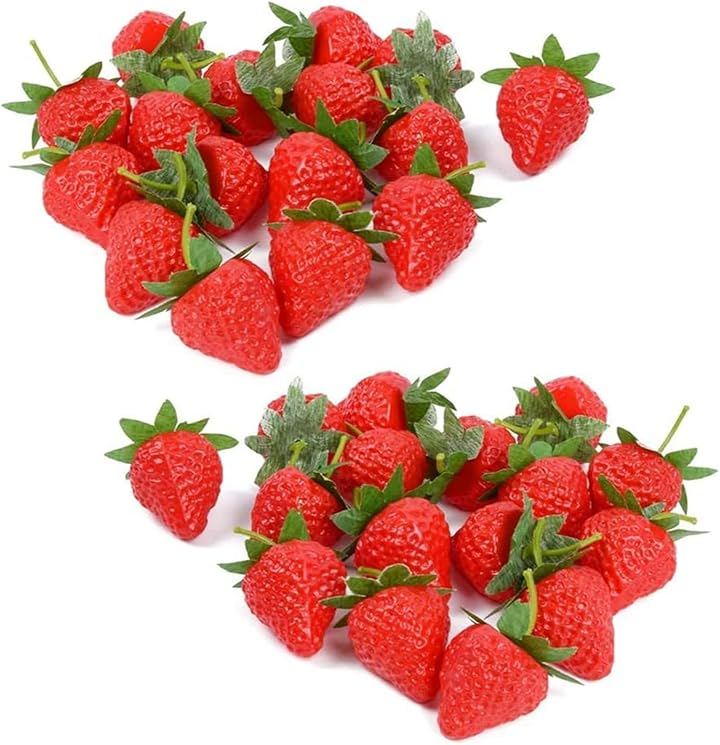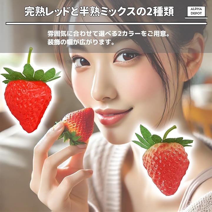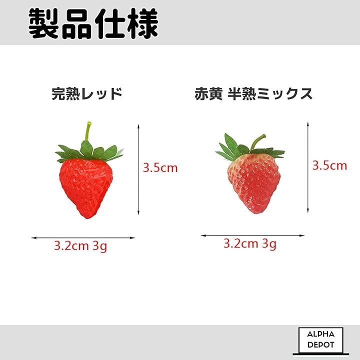内容:イチゴ模型50個セット / カラー:完熟レッド・赤黄 半熟ミックスの2タイプ / サイズ:約3.5cm / 素材:果実・茎:PVC / ヘタ:ナイロン