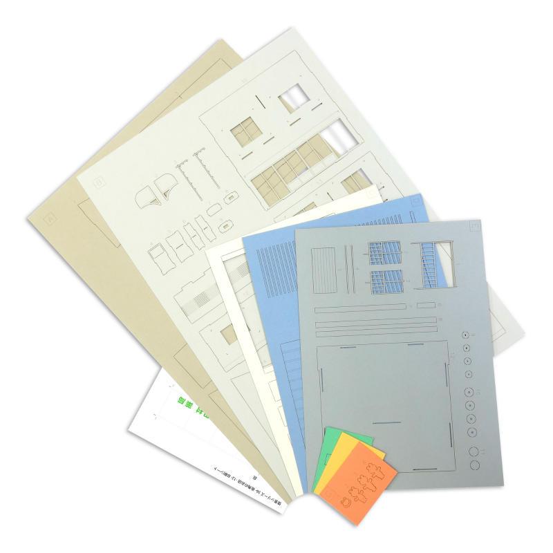 セット内容:レーザーシートA〜H(8枚)、屋根シート(1枚)、プラ板(1枚)、印刷シート(1枚)、組み立て説明書