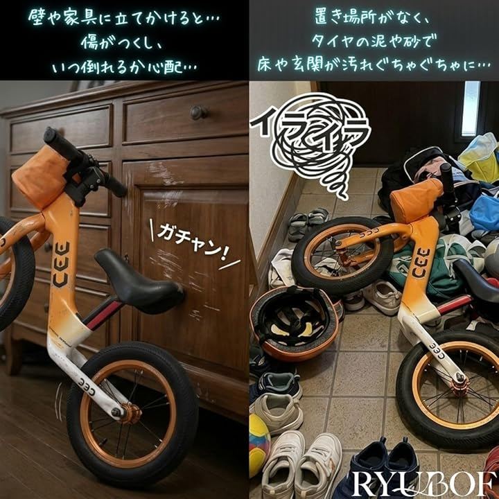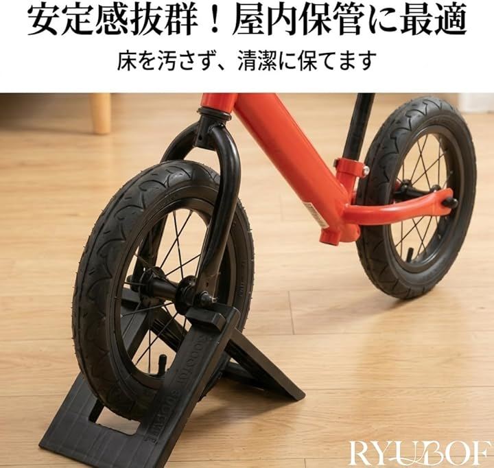 「安定感抜群のストライダースタンド」 子供用自転車やストライダーをしっかり固定できる安定感抜群のスタンドで、床に直接タイヤが触れない設計だから部屋を汚さず清潔に保つことができ、屋内保管にもぴったりです。