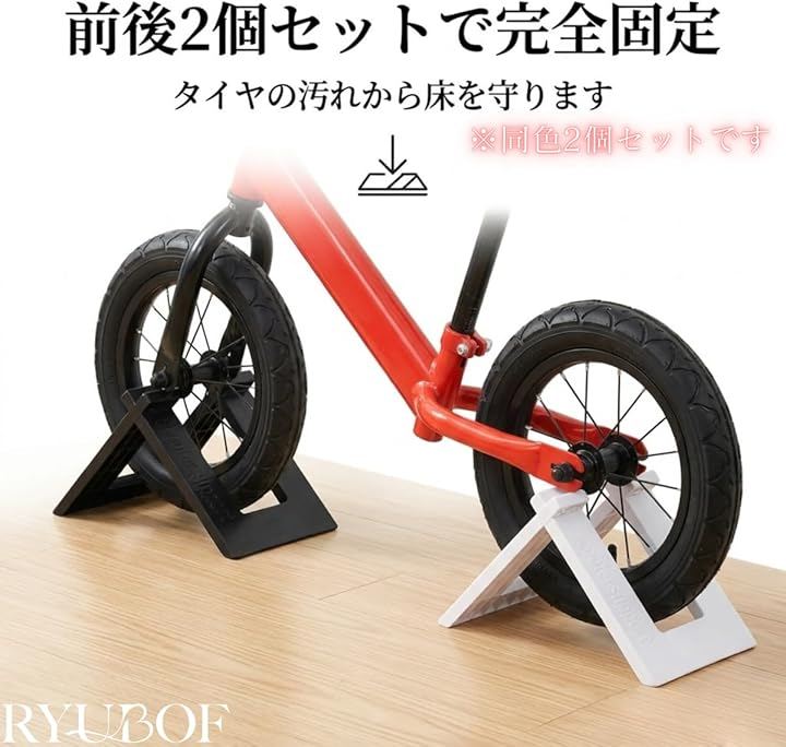 「清潔に保てる2個セット仕様」 このストライダースタンドは前後に設置できる2個セット仕様で、タイヤの汚れが床に付かずお掃除の手間を減らし、いつでも清潔で快適な自転車収納環境を作ります。