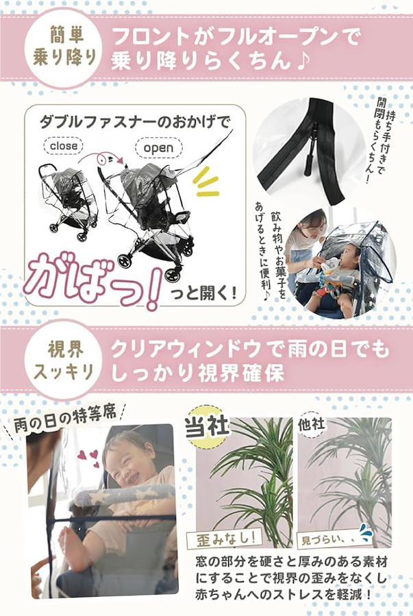 また雨の日にはもちろんですが、風や雪、寒さやほこり、花粉、ウイルスからも赤ちゃんを守ってくれるためとても汎用性が高く、レインカバー以外の使用方法も可能です。