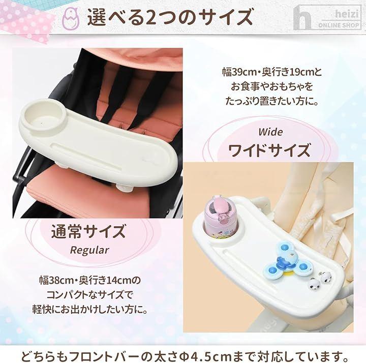 「セット内容」ベビーカー用テーブル(ドリンク&スマホ置き有り)x1、固定用クリップx2 サイズ:「通常サイズ」トレー:幅38cm、奥行き14cm、高さ5.5cm ドリンクホルダー直径約8.5cm 固定用クリップ:固定用クリップ間/約18cm 太さ4.5cmまでのフロントバーに対応