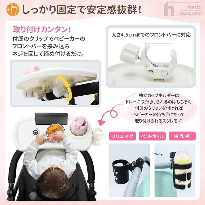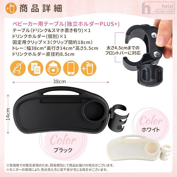「セット内容」ベビーカー用テーブル(ドリンク&スマホ置き有り)x1、ドリンクホルダー(個別)x1、固定用クリップx3 <サイズ>トレー:幅38cm、奥行き14cm、高さ5.5cm ドリンクホルダー直径約8.5cm 固定用クリップ:固定用クリップ間/約18cm 太さ4.5cmまでのフロントバーに対応
