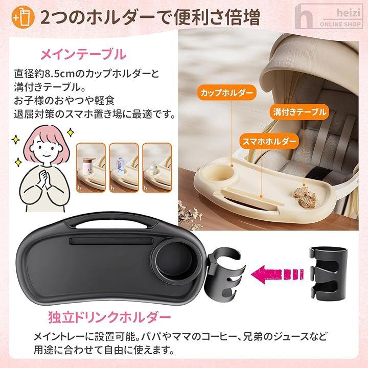 「家族みんなで快適に」「子どもの飲み物、大人の飲み物、スマホ、おやつ…全部どこに置こう?そんな悩みを解決する、進化したベビーカー用トレーが登場しました。ドリンク&スマホ置き付きのメインテーブルに加え、もう一つ独立したドリンクホルダーが付属。