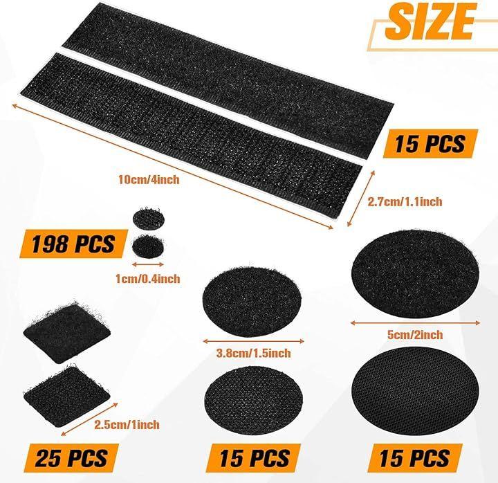 パッケージ内容: 1cm 丸いドット 198 個、3.8cm 丸型面ファスナー 15 個、5cm 丸型面ファスナー 15 個、長さ 2.5 x 10cm のストリップ 15 個、さまざまな形状と数量の 2.5 x 2.5cm 正方形の留め具 25 個で、毎日のニーズを満たすことができます