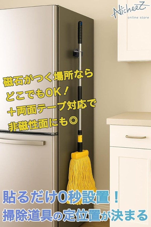 「掃除道具をスッキリ収納して、家事のストレスを軽減」モップやほうき、コロコロなど、立てかけにくくて置き場所に困りがちな掃除道具を、壁にスッキリ収納できるマグネット式ホルダー。