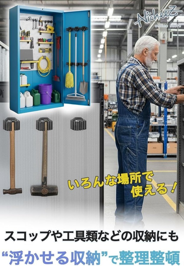 モップやほうきだけでなく、ガレージの工具や、玄関の傘、庭のスコップなど幅広いアイテムの収納や整理整頓に活用できます。