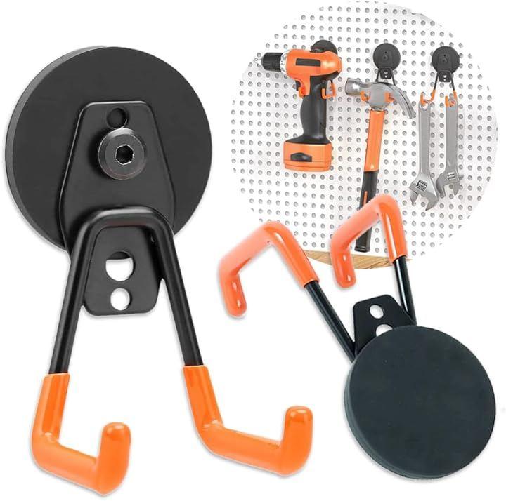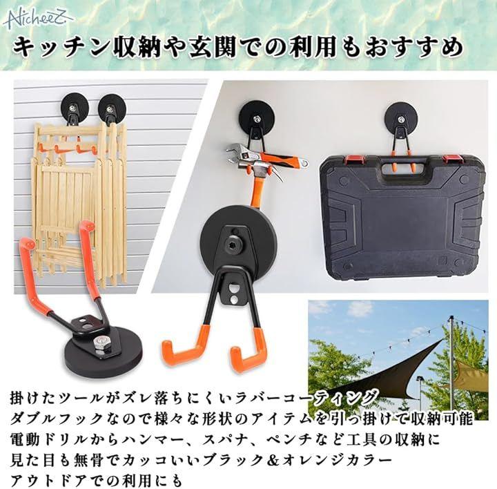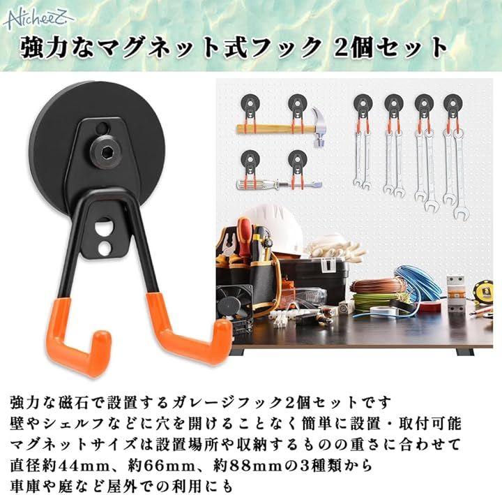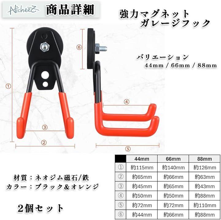 「商品内容」 強力マグネットガレージフック(2個セット) 材質:ネオジム磁石/鉄 カラー:ブラック&オレンジ サイズ:直径/約44mm/約66mm約88mm