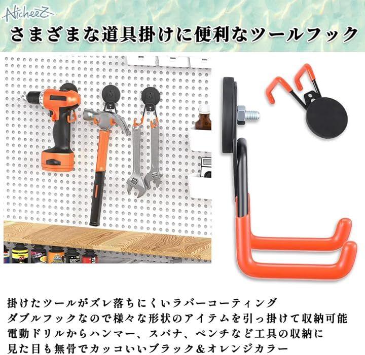 「さまざまな道具掛けに便利なツールフック」掛けたツールがズレ落ちにくいラバーコーティングが施されたフックデザイン。
