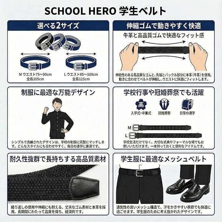 選べる 2サイズ展開 (*バックルを含めた全長表記) Mサイズ ウエスト 66~78cm対応 全長 101cm(バックル含む) Lサイズ ウエスト 75~87cm対応 全長 110cm(バックル含む) ベルト幅:32mm 中学生・高校生の制服・通学用として設計された、 無駄のないシンプルデザインの学生ベルトです。
