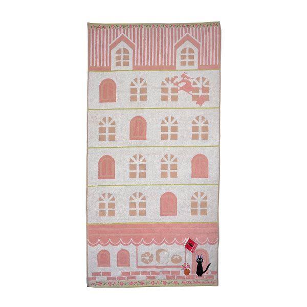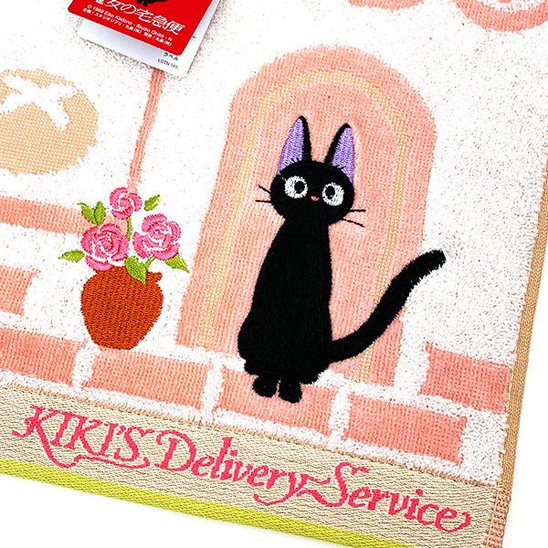 ちょこんとお座りしているジジがかわいい!よく見るとキキのシルエットもデザインされています♪オーガニックコットンの質の良いバスタオルです。