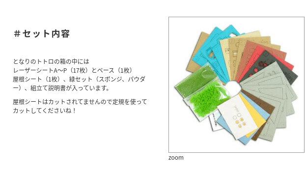 ■セット内容 レーザーシートA〜P(17枚)とベース(1枚) 屋根シート(1枚)、緑セット(スポンジ、パウダー)、組立て説明書